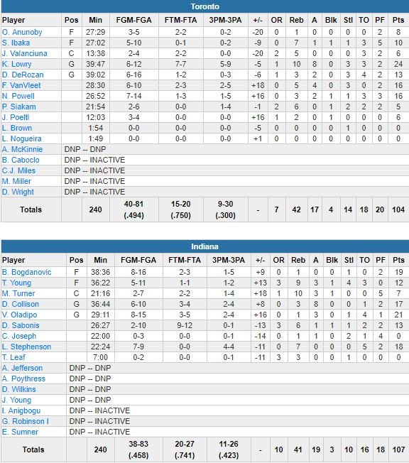 Indiana a dominé Toronto à la maison, 107-104. Victor Oladipo termine meilleur marqueur des Pacers avec 21 points à 8/15 mais est sorti sur une blessure au genou en milieu de 4ème quart. L’équipe peut ainsi surtout remercier Lance Stephenson, auteur de 13 de ses 18 points dans le dernier quart-temps pour aller chercher une 5ème victoire de rang. Indiana est passé devant grâce à un 31-20 dans le 3ème quart. Fred VanVleet a eu l’occasion d’égaliser à 6 secondes de la fin à 3-points après un 1/2 aux lancers de Myles Turner mais sa tentative au buzzer était ratée.