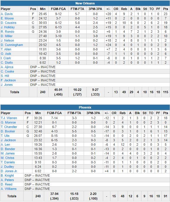 Enfin les Pelicans d’Anthony Davis (23 points et 9 rebonds) et DeMarcus Cousins (19 points et 10 rebonds) se sont imposés 115-91 à Phoenix. Leur 3ème victoire consécutive après Oklahoma City et San Antonio. Les deux stars n’ont même pas eu besoin de jouer les 12 dernières minutes de la rencontre. New Orleans a mené de 12 points après un quart-temps, puis de 30 à la pause. L’équipe a battu son record de points sur une mi-temps cette saison avec 72, avant de réussir à tranquillement conserver son avance tout en préservant ses cadres sur les deux derniers quarts. T.J. Warren termine meilleur marqueur des Suns avec 18 points à 7/14.