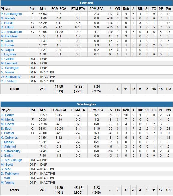 Portland a pris un avantage définitif (106-105 à 21 secondes) sur un shoot à 6m de McCollum, qui a joué les dernières 8’53 du match avec 5 fautes ! Bradley Beal (26 points à 10/24, 7 rebonds), encore une fois sans John Wall (genou) mais accompagné par un Otto Porter Jr. à 24 points à 9/15 et 10 rebonds, a manqué un tir à 6.5 secondes de la fin puis un 3-points au buzzer. Pat Connaughton s’est lui chargé d’assurer 2 lancers à 2.6 secondes.