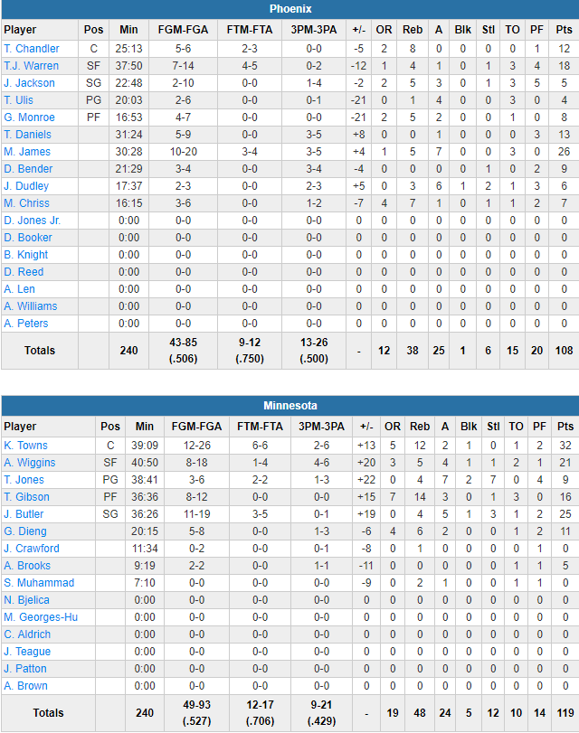 Le 5 majeur des loups a été très performant avec 32 points à 12/26 et 12 rebonds de Karl-Anthony Towns, 25 points à 11/19 de Jimmy Butler, 21 points à 8/18 d‘Andrew Wiggins, 16 points et 14 rebonds de Taj Gibson et 9 points, 7 passes et 7 interceptions de Tyus Jones. Minnesota prend pas moins de 19 rebonds offensifs en plus de 52.7% au tir. Côté Suns, c’est bien moins brillant pour le 5 majeur avec 18 points pour TJ Warren, mais le meilleur Sun est Mike James, auteur de 26 points à 10/20 et 7 passes.