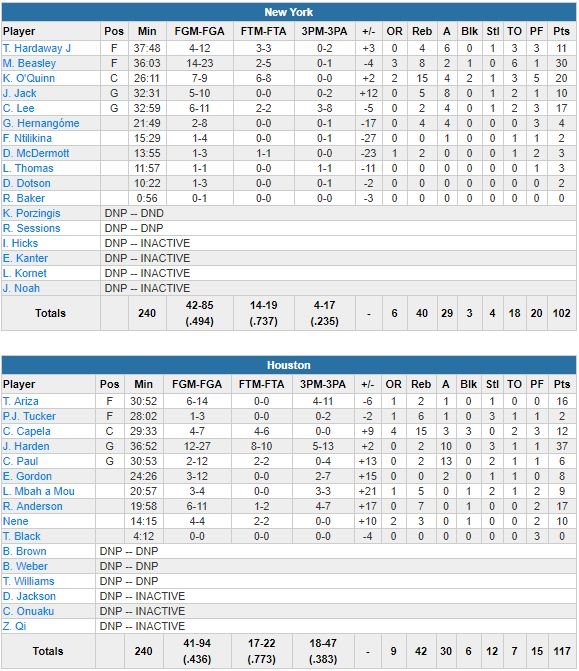 Houston termine à 18/47 à 3-points (contre 4/17 pour New York, qui jouait sans Kristaps Porzingis et Enes Kanter, tous les deux touchés au dos) et bénéficie de 44 points marqués par son banc, Ryan Anderson et ses 17 points en tête. Très adroits en début de match, Michael Beasley (30 points à 14/23 et 8 rebonds), Kyle O’Quinn (20 points à 7/9, 15 rebonds, 4 passes et 2 contres) et compagnie prennent les devants 29-7 en milieu de 1er quart. Mais les shoots finissent par ne plus tomber dedans, les ballons perdus se multiplient et les Rockets reviennent doucement au score à coups de 3-points. Mené 39-29 à la fin du 1er quart, Houston égalise ainsi à 51 partout avant de rentrer au vestiaire avec un retard de 3 points, 61-58.