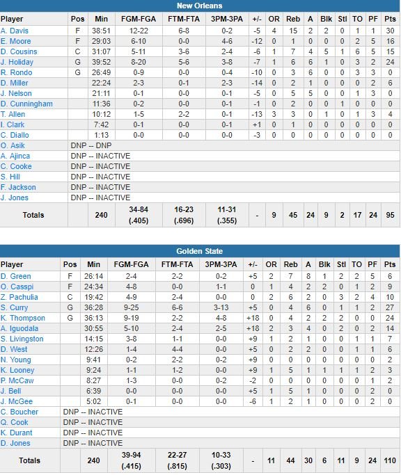 Les Warriors déroulent dans le 2ème et le 3ème quart-temps (respectivement remportés 36-22 et 31-22) mais les hommes d’Alvin Gentry trouvent les ressources pour un comeback dans le dernier quart. New Orleans recolle ainsi à 99-93 sur un 3-points de Cousins. Curry lui répondra avec un tir à 5m et les Warriors boucleront leur match sur un 11-2.