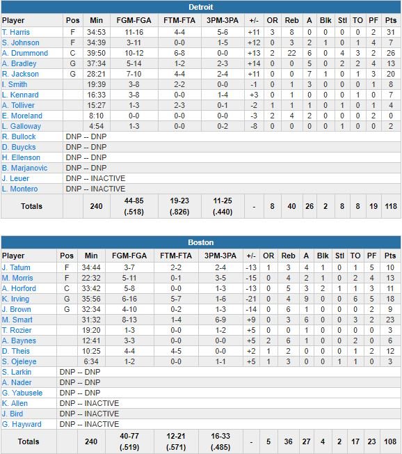 Les Pistons sont devenus cette nuit les premiers à battre Boston d’au moins 10 points cette saison ! Menés par un Andre Drummond déchaîné (26 points à 10/12, 22 rebonds, 6 passes et 4 interceptions), 31 points à 11/16 et 8 rebonds de Tobias Harris et 20 points à 7/10 et 7 passes de Reggie Jackson, les Pistons l’ont emporté 118-110 face à Kyrie Irving (18 points à 6/16, 4 rebonds, 9 passes, 6 ballons perdus et compagnie (23 points à 6/9 à 3-points de Marcus Smart). Et au TD Garden s’il vous plaît !