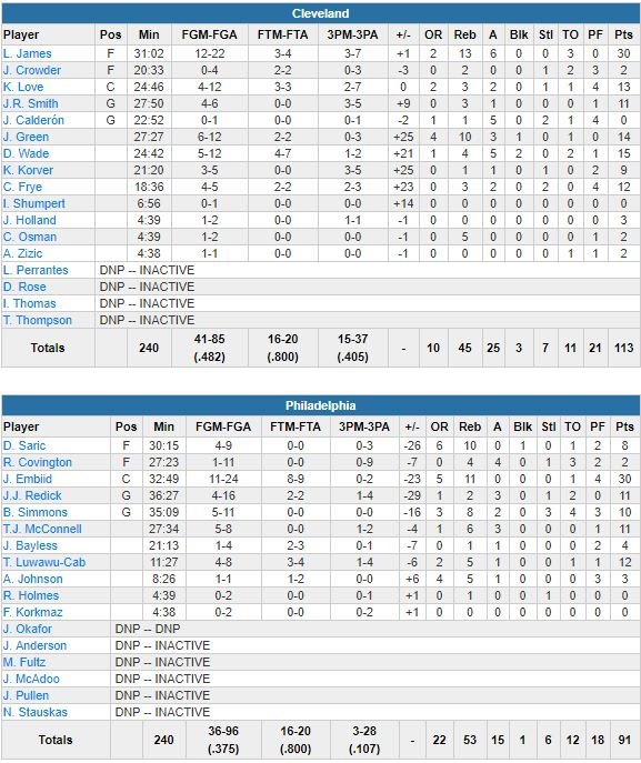 Philadelphie, malgré 30 points à 11/24 et 11 rebonds de Joel Embiid, a souffert de la bonne défense de Jae Crowder sur Ben Simmons (10 points à 5/11, 8 rebonds, 2 passes, sorti sur une entorse de la cheville droite dans le dernier quart) et voit sa série de 3 succès consécutifs (et 5 en 6 matchs) stoppée. Au retour des vestiaires, James enchaîne 4 points dont un gros dunk, J.R. Smith (11 points à 4/6) plante trois 3-points et les Cavaliers vont prendre jusqu’à 14 points d’avance. Les 76ers se rapprocheront à 5 points dans la période mais cela n’empêchera pas Cleveland d’entamer le 4ème en tête 86-73. Un 3-points de Kyle Korver (9 points à 3/5) à 9’13 donnera ensuite 17 points d’avance aux siens.