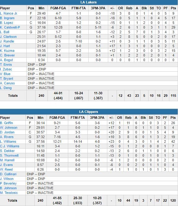L’équipe de Doc Rivers a comblé un retard de 8 points dans le 3ème quart pour aller chercher une 3ème victoire de suite pour la première fois depuis leur 4-0 en début de saison. Quant aux Lakers, ils ont terriblement manqué de réussite dans le money time, en plus d’avoir fait des choix douteux. Kentavious Caldwell-Pope a été le seul à se détacher avec 29 points à 12/28, 6 rebonds et un panier clutch pour revenir à 116-115 à 48 secondes de la fin. Williams va ensuite tranquillement aller trouver un layup avant que Brandon Ingram (17 points à 6/10) ne manque un shoot dans le corner pour les Lakers. Williams obtient ensuite la faute et rentre ses deux lancers-francs pour définitivement achever son ancienne équipe.