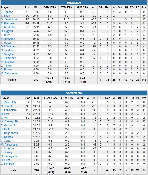 À noter : les Kings ont perdu 11 de leurs 16 ballons en 1ère mi-temps. Milwaukee a shooté à 59.2% aux tirs, contre 40.3%