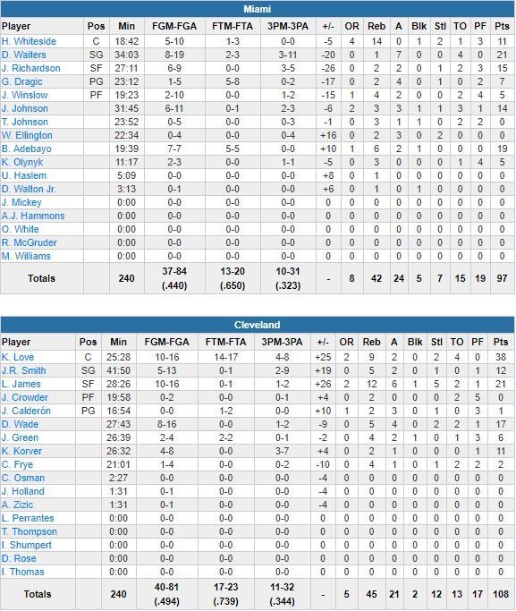 Love a martyrisé tous les défenseurs qui se présentaient à lui avec un 10/16 aux tirs dont un 4/8 à 3-points et 14/17 aux lancers-francs, plus 9 rebonds, 2 passes et 2 interceptions. Il a inscrit 22 points sur les 12 premières minutes, soit seulement 2 points de moins que l’ensemble de l’équipe adverse, et permis à Cleveland de prendre 27 points d’avance à la pause, 75-49. Miami va ensuite dominera les deux derniers quarts-temps 48-33 et réussir au mieux à revenir à 17 points (93-76) en début de 4ème mais Wade inscrit les 6 premiers points de Cleveland dans la période avant de servir Kyle Korver, dont le 3-points porte le score à 102-79.