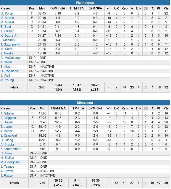 Les Wolves ont eu deux chances derrière sans réussir à les convertir en points. À 4.2 secondes de la fin, le ballon a été rendu aux Wizards sur une remise en jeu dans un premier temps sifflée en faveur de Minnesota, mené par 3 joueurs en double-double : Karl-Anthony Towns avec 20 points à 9/19 et 17 rebonds, 17 points, 7 rebonds et 10 passes de Jimmy Butler et 16 points et 11 rebonds de Taj Gibson.