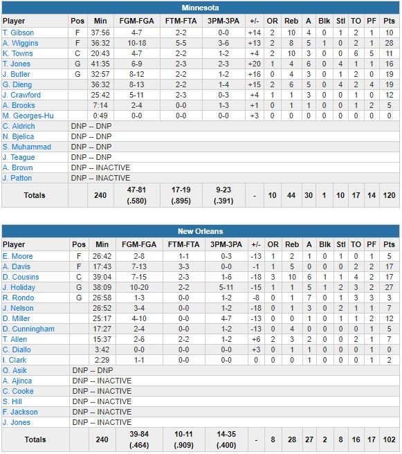 Minnesota en tête 45-43, Anthony Davis écope d’une faute technique. Quinze secondes plus tard, il en prend une seconde et se retrouve expulsé pour la première fois en 6 ans en carrière. Les Wolves en ont profité pour terminer leur mi-temps sur un 17-6 et mener 62-49 à la pause. En 17 minutes, Davis a compilé 17 points à 7/13 et 5 rebonds. DeMarcus Cousins, deuxième meilleur marqueur des Pelicans (17 points à 7/15, 10 rebonds, 6 passes) derrière Jrue Holiday et ses 27 points (10/20, 5 passes) n’a pas manqué d’exprimer son mécontentement après le match