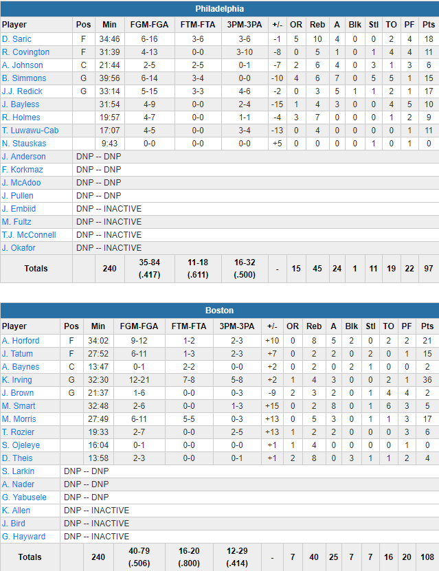 Les Celtics ont pris les commandes de la rencontre dans le premier acte sous l’impulsion d’Irving et Horford pour mener 28-22 après 12 minutes. Maladroit à 2-pts les Sixers ont fait la course derrière mais sans jamais être totalement lâchés en étant en réussite derrière l’arc. A la pause les locaux menaient 54-44. Le bon début de seconde mi-temps de Redick et Saric ont mis Philly à seulement 4 points, puis sur un 11-2 sous l’impulsion d’Holmes et Covington, les hommes de Brett Brown ont même pris la tête 67-65. Morris a alors enchaîné 3 paniers de suite pour lancer un 9-0 qui a remis Boston en tête 76-71 avant les 12 dernières minutes. Les C’s ont évité un retour de Philly en démarrant par 7 de leurs 11 tirs réussis pour porter leur avance à 95-82. Ils ont bien géré la suite grâce à Kyrie Irving.