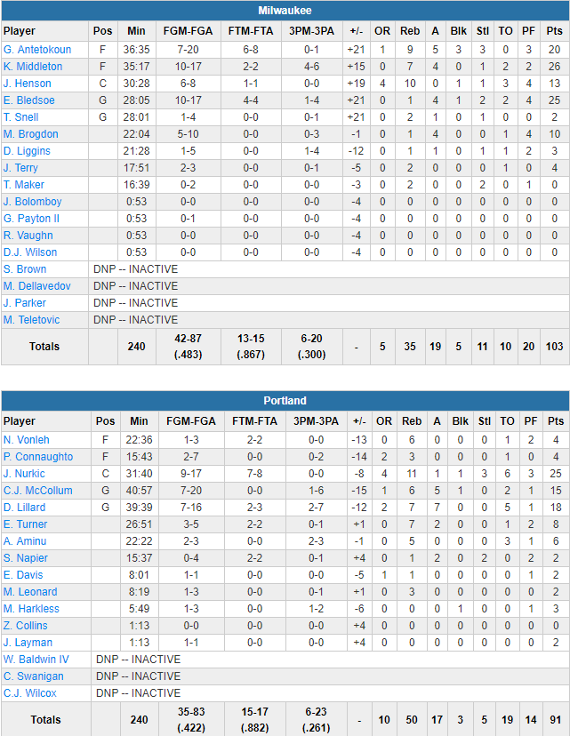 Les Bucks ont été menés par un excellent trio Khris Middleton (26 points à 10/17, 7 rebonds et 4 passes), Eric Bledsoe (25 points à 10/17 et 4 passes) et Giannis Antetokounmpo (20 points à 7/20, 9 rebonds, 5 passes, 3 contres et 3 interceptions). Les Blazers ont connu une soirée difficile avec seulement 42.2% au tir et 19 ballons perdus, à l’image de leur backcourt Damian Lillard (18 points à 7/16, 7 rebonds et 7 passes) – CJ McCollum (15 points à 7/20, 6 rebonds et 5 passes) en-dessous de leurs standards. L’excellent match de Jusuf Nurkic (25 points à 9/17 et 11 rebonds) n’a pas suffi et ils ont compté jusqu’à 24 points de retard.