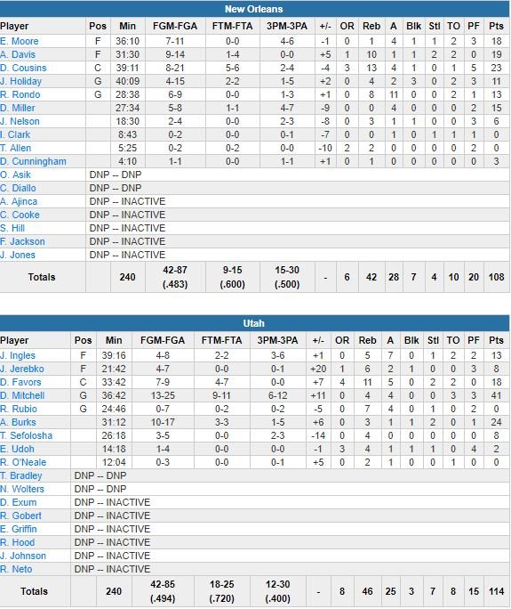 Mené de 12 points à la pause puis de 16 dans le 3ème quart, le Jazz (18 points et 11 rebonds de Derrick Favors) va se relancer dans le sillage d’un duo Mitchell (29 points en seconde mi-temps)- Alec Burks (24 points) à 21 points dans la période. L’équipe lance ensuite son dernier quart sur un 10-0 et prend les affaires en mains, 90-84. New Orleans répond par un 10-0 pour reprendre 6 points d’avance mais c’était sans compter sur l’énorme fin de match de Mitchell, qui entre layups et pull-ups va inscrire 5 points d’un 9-0 pour définitivement assurer la victoire aux siens alors que les deux équipes étaient à égalité 103 partout.