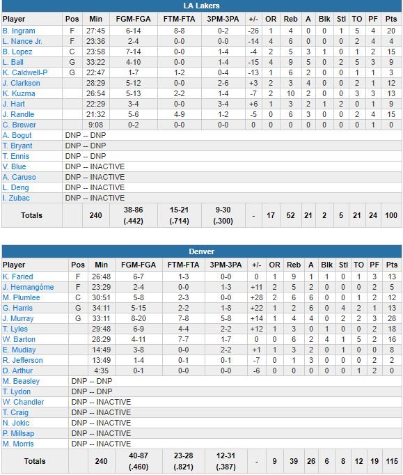 Sans un trio à presque 40 points et 21.2 rebonds par match (Nikola Jokic, Paul Millsap et Wilson Chandler), les Nuggets ont été dominés 52-39 au rebond cette nuit par les Lakers. Mais menés par Jamal Murray (28 points à 8/20, 4 rebonds, 4 passes) et Will Barton (13 de ses 16 points dans les dernières 7’44), ils ont tenus leurs adversaires à 2 points seulement sur les dernières 5’41 du match pour aller chercher un 7ème succès de rang au Pepsi Center. Denver a inscrit les 15 derniers points de la partie et s’est donc logiquement imposé, 115-100.