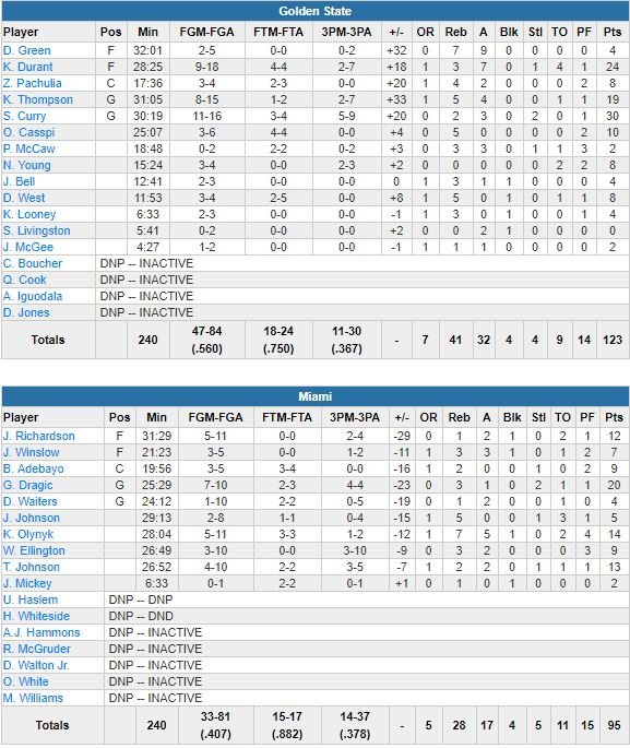 À noter : la veille, Steve Kerr avait exceptionnellement octroyé une journée de libre à ses joueurs afin de profiter du beau temps et de la plage. Shaun Livingston a été exclu à 6’24 de la fin de la 1ère mi-temps pour avoir collé son front à celui de l’arbitre en discutant d’un coup de sifflet. Andre Iguodala (genou) n’a pas joué. Dion Waiters a été limité à 1/10 aux tirs. Miami a été dominé 58-38 dans la peinture et 41-28 au rebond.