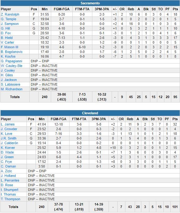 À noter : menés par les 18 points et 10 rebonds de Zach Randolph, 17 points de Buddy Hield et 16 rebonds de Sampson, les Kings ont remporté la première mi-temps 57-48.