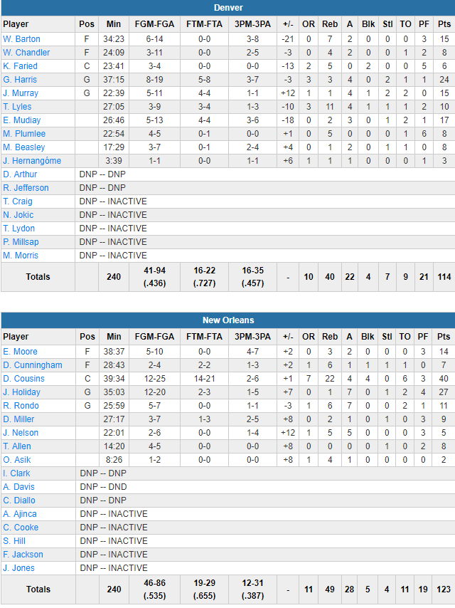 En l’absence d‘Anthony Davis, DeMarcus Cousins a pris les choses en main face à Denver et a piétiné ses derniers. Il compile 40 points à 12/25, 22 rebonds, 4 passes et 4 contres pour mener les siens à la victoire 123-114. Il a été très bien aidé par un excellent Jrue Holiday auteur de 27 points à 12/20 et 7 passes alors que E’Twaun Moore marque 14 unités. Privés de Nikola Jokic et Paul Millsap les Nuggets ont manqué d’inspiration parfois en attaque et shoote à seulement 43.6% avec 24 points de Gary Harris, 17 d’Emmanuel Mudiay et 15 de Will Barton et Jamal Murray. Serrés pendant trois quart temps, le match a basculé en début de dernier acte avec 20-3 des locaux qui a assommé Denver.
