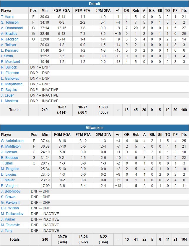 On commence par la victoire des Bucks face aux Pistons avec un énorme duel de trios puisque 3 joueurs de chaque équipe marquent au moins 20 points mais c’est Milwaukee qui a le dernier mot pour l’anniversaire de Giannis Antetokounmpo, 104-100. Le Greek Freak sort 25 points à 8/16, 10 rebonds et 4 passes, bien aidé par Khris Middleton (21 points à 7/10 et 6 passes) et Eric Bledsoe (22 points à 9/21). En face Andre Drummond compile 27 points à 12/16, 20 rebonds et 6 passes, Tobias Harris 21 points à 8/14 et enfin Avery Bradley 20 points à 5/13. Alors qu’ils comptaient 9 points d’avance à la pause les Bucks ont connu un 3ème quart compliqué qui a remis Detroit dans le match. Mais les locaux ont fait basculer la rencontre en leur faveur grâce à un 14-1 pour débuter le dernier acte.