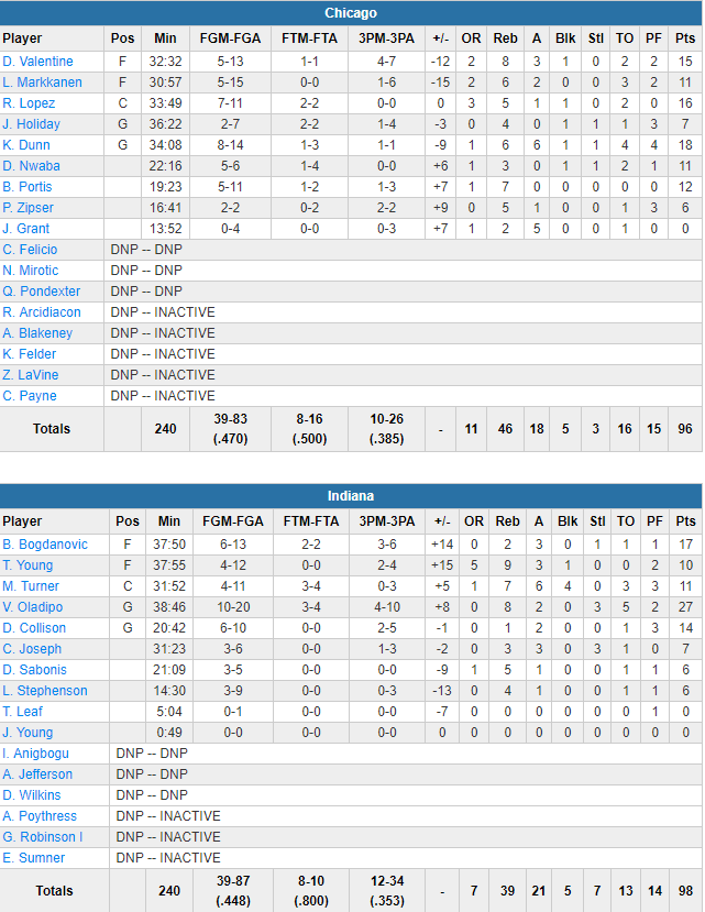 On peut toujours s’attendre à une raclée contre les Bulls cette saison mais ça n’a pas été le cas pour Indiana cette nuit. L’équipe s’en est sortie in extremis sur un 3-points clutch de Victor Oladipo (27 points) à 31.1 secondes pour une victoire de 2 points au final. Chicago (en tête 55-39 à la pause) a encaissé un 29-13 dans le dernier quart après avoir pris jusqu’à 17 points d’avance au cours de la rencontre. Lauri Markkanen (11 points) a ensuite raté le potentiel 3-points de la victoire dans les dernières secondes, officialisant la 10ème défaite d’affilée des Bulls (18 points, 6 rebonds, 6 passes de Kris Dunn), qui ont au moins réussi l’exploit de tenir la 4ème attaque NBA sous la barre des 100 points.