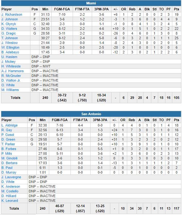 À noter : Tony Parker signe 10 points et 9 passes (record pour un meneur des Spurs cette saison) en 19 minutes et n’a perdu aucun match depuis son retour (5-0). Hassan Whiteside a manqué un 4ème match consécutif (genou) pour Miami (18 ballons perdus à 11). Manu Ginobili signe 10 points en 25 minutes.
