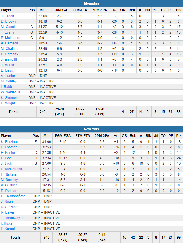 L’homme du match c’est Courtney Lee, auteur de 24 points à 10/17 dont 4/6 à 3-pts alors que Kristaps Porzingis ajoute 18 points à 8/18 et Michael Beasley 14 points à 5/7 en sortie de banc. Jarrett Jack fait lui le job à la mène avec 10 points et 10 passes tandis que Frank Ntilikina compile 8 points, 2 passes et 3 interceptions. Les Grizzlies ont eu de gros soucis en attaque, limités à 88 points à 41.4% avec 15 ballons perdus. Tyreke Evans shoote à seulement 4/13 (15 points) et Marc Gasol 5/12 (17 points et 8 rebonds).