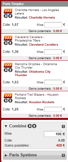 Cela nous donne une cote de 4.08 au total (elle peut varier) sur laquelle on va miser le pari remboursé pour un gain potentiel de 308€.