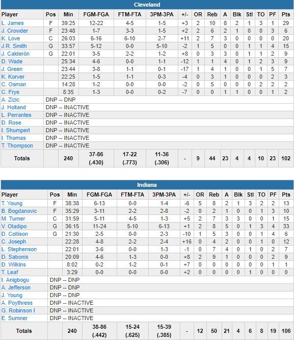 Cleveland réussit à revenir à 104-102 sur un nouveau tir lointain de Smith à 10 secondes mais n’aura jamais plus l’occasion d’égaliser ou de repasser devant. Cory Joseph (12 points à 4/8) rentre 2 lancers-francs et Myles Turner (15 points à 5/11, 7 rebonds, 3 passes, 3 contres) récupère le rebond du 3-points manqué de Kevin Love (20 points à 6/16, 7 rebonds, 3 passes) pour définitivement mettre les siens à l’abri.