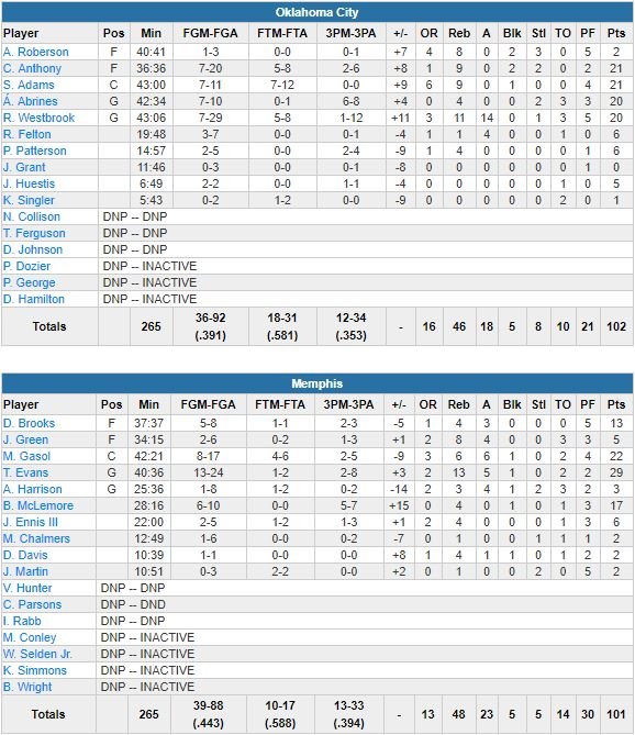 Memphis, avec 29 points et 13 rebonds de Tyreke Evans, 22 points de Marc Gasol et 17 de Ben McLemore, a pris jusqu’à 20 points d’avance en 1ère mi-temps, mais s’incline pour la 3ème fois d’affilée et pour la 14ème fois en 15 rencontres. OKC (mené 57-46 à la pause) est revenu dans le match avec un gros 3ème quart dans lequel les hommes de Billy Donovan ont limité leurs adversaires à seulement 9 points (21-9). Les deux équipes à égalité 92 partout, Westbrook s’est fait contrer par Andrew Harrison sur une tentative à 3-points qui a envoyé le match en prolongation. Evans redonne l’avantage aux locaux 101-98 sur un 3-points à 1’03 de la fin du match et le score ne bougera plus jusqu’au drive de Westbrook à 13.8 secondes pour revenir à 1 point. JaMychal Green va ensuite manquer 2 lancers-francs, laissant un boulevard au MVP en titre pour tuer le match sur la ligne.