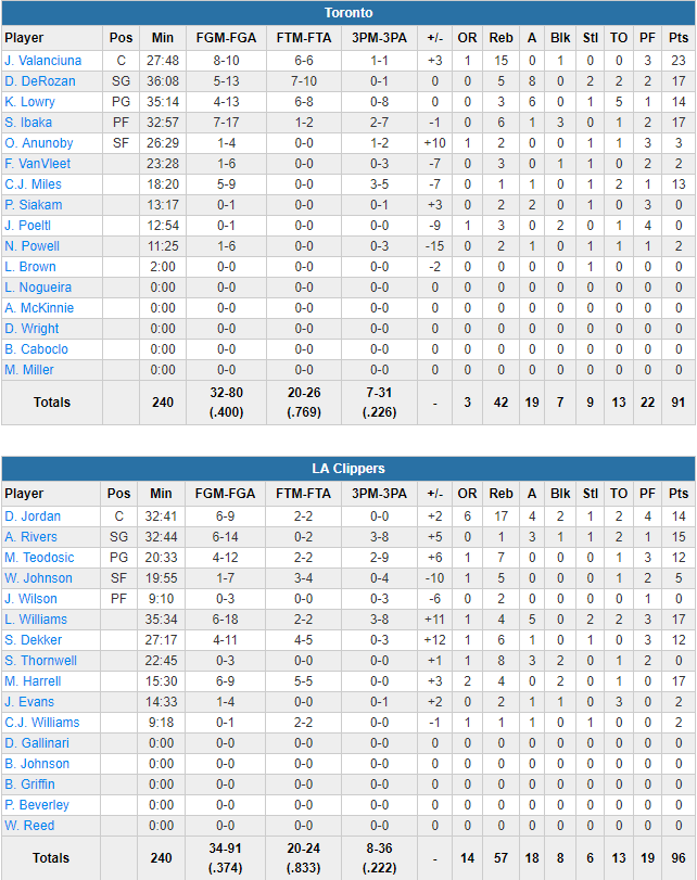 Ce match les Raptors le tenaient en menant quasiment de bout en bout puisque après un premier quart conclu sur le score de 30-19, ils ont été aux commandes jusque dans le money time. Ils n’ont jamais réussi à distancer les locaux et ont fini par le payer. Devant de 7 points à 6’14 du buzzer, ils ont encaissé un 14-3 sous l’impulsion de Milos Teodosic, Austin Rivers et Sam Dekker. Les Clippers se sont retrouvés en tête 88-84 sur une claquette de DeAndre Jordan à 1 minute du terme mais Lowry a redonné espoir aux siens avec un 2+1. Moment choisi par Teodosic pour planter un nouveau 3-pts qui a offert la victoire aux siens, qui ont tenu sur la ligne des lancers.