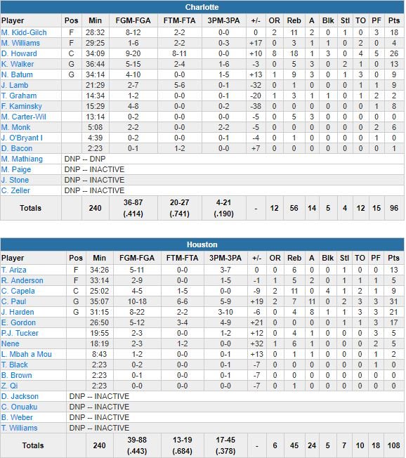 À noter : les Hornets sont revenus à 79-65 grâce à un 8-0 en fin de 3ème quart-temps mais Houston y a répondu par un 12-4 pour mener 91-69 avant de jouer le dernier quart. Les Rockets ont scoré les 14 derniers points du 1er quart avec Harden sur le banc. Nicolas Batum était de retour après un match manqué (coude gauche douloureux) et a signé 9 points et 9 rebonds.
