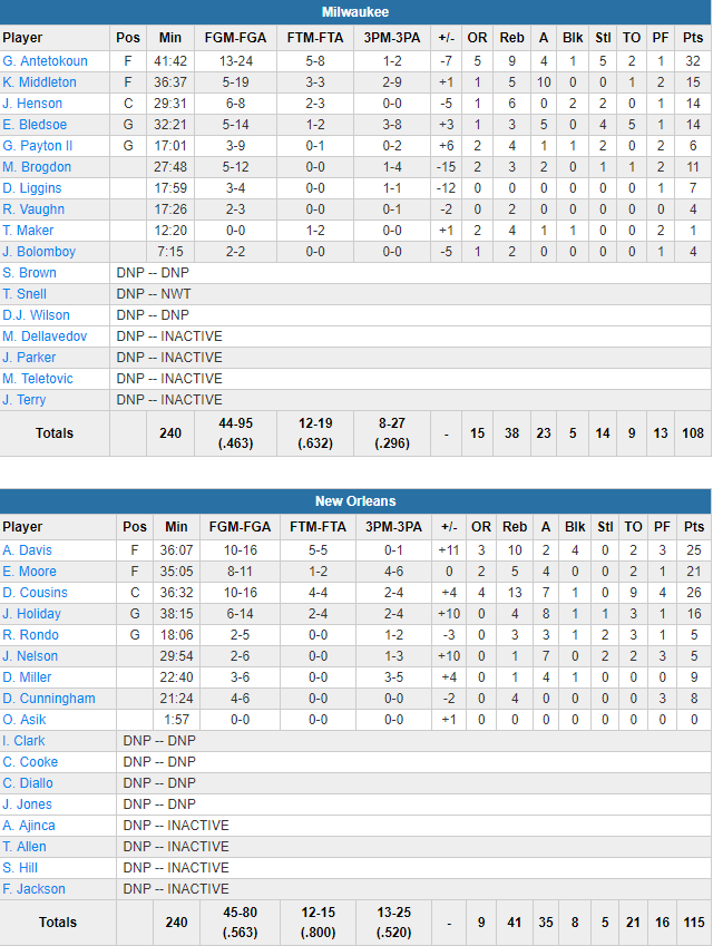 De retour, Anthony Davis a brillé avec 26 points à 10/16, 10 rebonds et 2 contres tandis que DeMarcus Cousins compile lui 26 points à 10/16, 13 rebonds et 7 passes. E’Twaun Moore est une nouvelle fois précieux avec 21 points à 8/11 dont 4/6 à 3-pts, 5 rebonds et 4 passes tandis que Jrue Holiday ajoute 16 points et 8 passes. Les Pelicans shootent de nouveau à un gros pourcentage : 56.3% dont un 13/25 à 3-pts, ce qui compense leurs 21 ballons perdus et les 15 rebonds offensifs laissés aux hommes de Jason Kidd. Ces derniers shootent à 46.3%, menés par les 32 points à 13/24, 9 rebonds et 5 interceptions de Giannis Antetokounmpo alors que Khris Middleton a été maladroit avec 15 points à 5/19 et 10 passes. Eric Bledsoe aussi avec 14 points à 5/14.