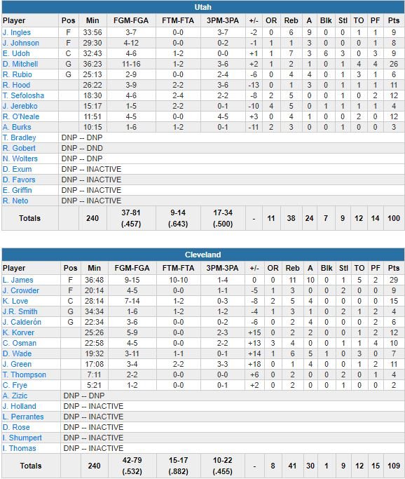 Cleveland (30 passes décisives à 24, 53.2% de réussite contre 45.7%) a repris la tête 51-48 à la pause. Utah ne s’est pas tout de suite laissé distancer et ne comptait encore qu’un point de retard en fin de 3ème quart-temps et après un tir à 3-points signé Thabo Sefolosha, 70-69. Jeff Green (11 points) et Kyle Korver (12 points) ont ensuite rentré un panier longue distance chacun, Dwyane Wade un 2+1, et les locaux ont pris 9 points d’avance, 89-80. Le Jazz revenu à 5 points 102-97 à 4 minutes de la fin, James a passé un 6-0 personnel à l’équipe de Quin Snyder pour tranquillement regagner le contrôle du match.