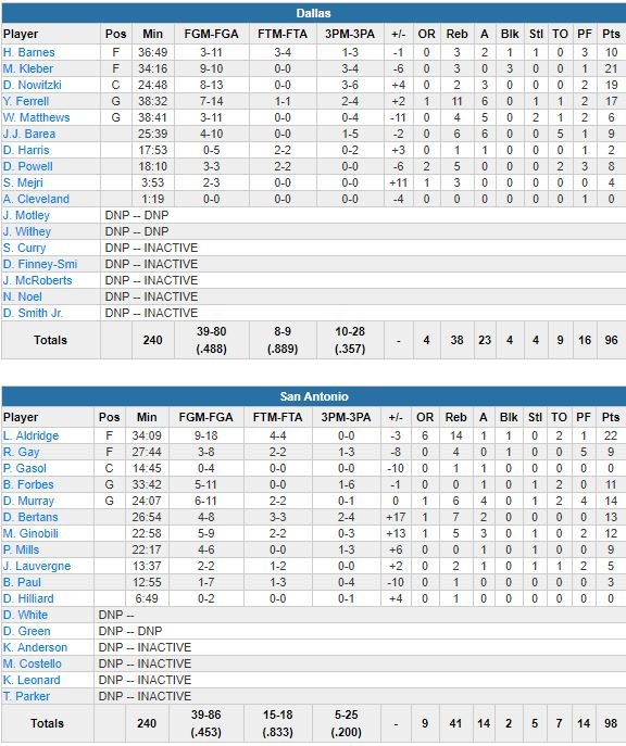 Il a fallu tout le talent de LaMarcus Aldridge (22 points, 14 rebonds et un panier pour égaliser à 96 partout à 23.4 secondes) et de Manu Ginobili (12 points et un layup à 3.1 secondes pour arracher la victoire) pour permettre aux Spurs de s’imposer 98-96 face aux Mavericks cette nuit.