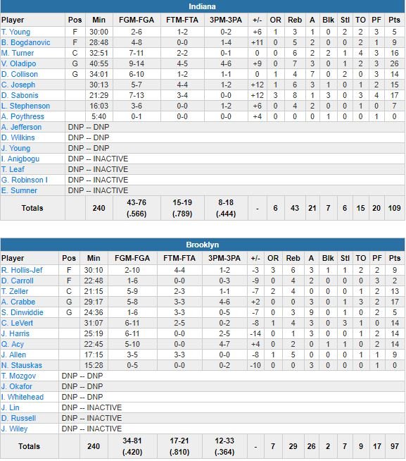 En visite à Brooklyn, les Pacers de Victor Oladipo (26 points à 9/14, 7 rebonds, 3 passes), Domantas Sabonis (17 points à 7/16, 8 rebonds et 3 contres), Myles Turner (16 points), Cory Joseph (15) et Darren Collison (14) l’ont emporté 109-97 dimanche au Barclays Center.
