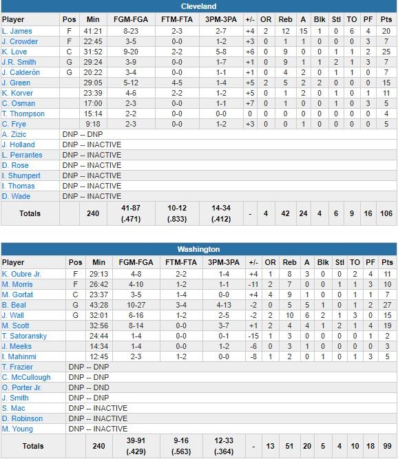 On lui pardonne donc ses 6 ballons perdus et ses 4 faute dans le seul 4ème quart-temps. Son coéquipier Kevin Love termine meilleur marqueur des Cavs avec 25 points à 9/20 et 9 rebonds, Jeff Green ajoute 15 points, Kyle Korver 11. Contrairement au dernier match de Cleveland au Verizon Center durant lequel James avait terminé à 57 points, il a cette fois a plutôt adopté un rôle de facilitateur. Bradley Beal est le meilleur marqueur de la rencontre avec 27 points, et John Wall signe lui 15 points, 10 rebonds et 6 passes en 32 minutes.