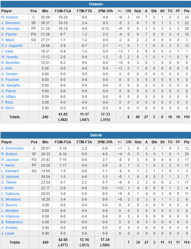 Detroit a égalé son record de shoots à 3-points avec 17 réussites en 34 tentatives dont 5 pour Anthony Tolliver (17 points) et 4 pour Reggie Bullock (20 points à 8/10). Tobias Harris et Reggie Jackson ajoutent 17 points et Andre Drummond compile 12 points et 6 rebonds. En face Orlando s’est appuyé sur un excellent Mario Hezonja, auteur de son record en carrière avec 28 points à 8/12 à 3-pts. Nikola Vucevic compile 24 points, 14 rebonds et 7 passes et Jonathon Simmons ajoute 23 points et 7 passes mais le trio a été trop seul.