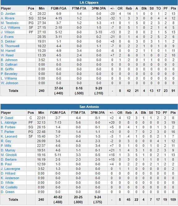 Sans 5 joueurs dont Blake Griffin et Lou Williams, les Clippers avaient bien peu d’espoir en arrivant à San Antonio lundi. Pour le premier match à domicile de la saison pour Kawhi Leonard (7 points à 3/4 et 4 rebonds en 15 minutes de jeu), ses coéquipiers ont fait en sorte de ne pas créer de mauvaise surprise. LaMarcus Aldridge a terminé meilleur marqueur avec 19 points, Tony Parker a ajouté 16 points et 7 passes en 23 minutes et San Antonio l’a emporté 109-91, sans forcer.