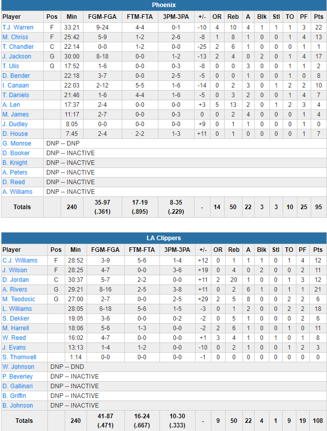 Les Clippers retrouvent la victoire après 3 défaites de rang en dominant les Suns 108-95 dans une rencontre qu’ils ont maîtrisé de bout en bout et dans laquelle ils ont compté jusqu’à 25 points d’avance. Austin Rivers est l’homme du match avec 21 points à 8/16 et 6 passes alors que DeAndre Jordan ajoute 12 points et 20 rebonds et Lou Williams sort du banc pour planter 18 points. En face les 22 points de TJ warren n’ont pas suffi.