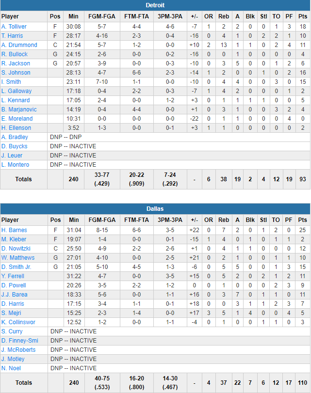 Belle victoire des Mavs, qui dominent avec la manière les Pistons sur le score de 110-93 dans le sillage d‘Harrison Barnes, auteur de 25 points. 6 Mavs marquent au moins 10 points et l’équipe shoote à 53.3% contre seulement 42.9% aux Pistons, dont Anthony Tolliver est le meilleur marqueur avec 18 points. C’est dans le second quart que Dallas a fait la différence en le remportant 43-28, avant d’enfoncer le clou dans le 3ème face à des Pistons limités à 13 unités.