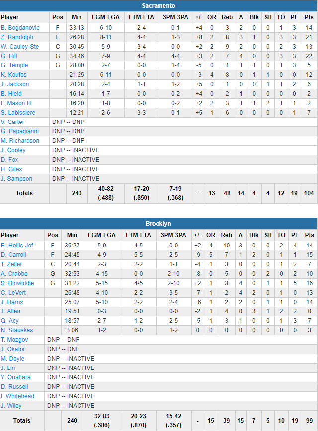 Les Kings enchaînent un second succès en 24 heures, cette fois à Brooklyn en dominant les Nets 104-99 grâce à Zach Randolph (21 points à 8/11 et 8 rebonds), George Hill (22 points à 7/9) et Bogdan Bogdanovic (14 points). Ils ont pris les commandes à la faveur d’un premier quart remporté 36-20 et ensuite ont tenu tant bien que mal puisque les locaux ont fini par faire leur retour en toute fin de rencontre. Ils sont revenus à 2 points à 5 minutes du terme mais les deux équipes ont été très maladroites en fin de match et finalement c’est sur des lancers que les Californiens ont assuré leur succès.