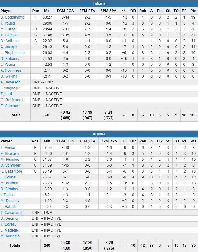 Deux jours après ses 38 points dans une défaite contre Boston, Victor Oladipo n’a eu besoin que de 23 points (8/15, 5 rebonds) pour mener les Pacers à la victoire à Atlanta cette nuit. Indiana a pris jusqu’à 20 points d’avance (sur un 3-points de Myles Turner, 20 points et 6 rebonds, à 2’55 de la fin) dans le dernier quart avant de laisser les Hawks (qui n’ont toujours pas gagné deux matchs consécutifs cette saison et qui ont shooté à 16/41 en 2ème mi-temps) marquer les 10 derniers points de la partie. Les titulaires d’Indiana ont dominé leurs vis-à-vis 77-49 dans le match. John Collins termine meilleur marquer des Hawks avec 18 points à 6/7 et 9 rebonds.