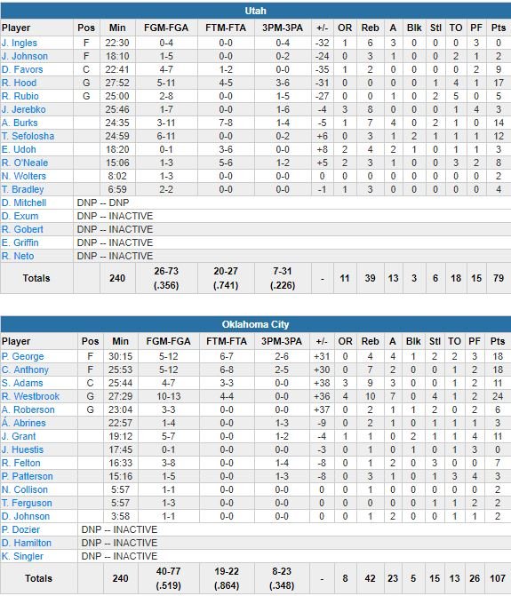 Russell Westbrook (24 points à 10/13, 10 rebonds, 7 passes et 4 interceptions) a mis ses coéquipiers sur la bonne voie en première mi-temps avant que ces derniers ne mettent le Jazz au tapis dans le 3ème quart-temps. Dominé dans le 3ème quart dans 14 de ses 16 derniers matchs, le Thunder, porté par 10 points chacun de Paul George (18 points à 5/12, 4 rebonds, 4 passes) et Carmelo Anthony (18 points à 5/12, 7 rebonds, 2 passes), ont remporté la période 34-23 avant de mener 87-60 au début du 4ème quart puis de s’imposer 107-79.