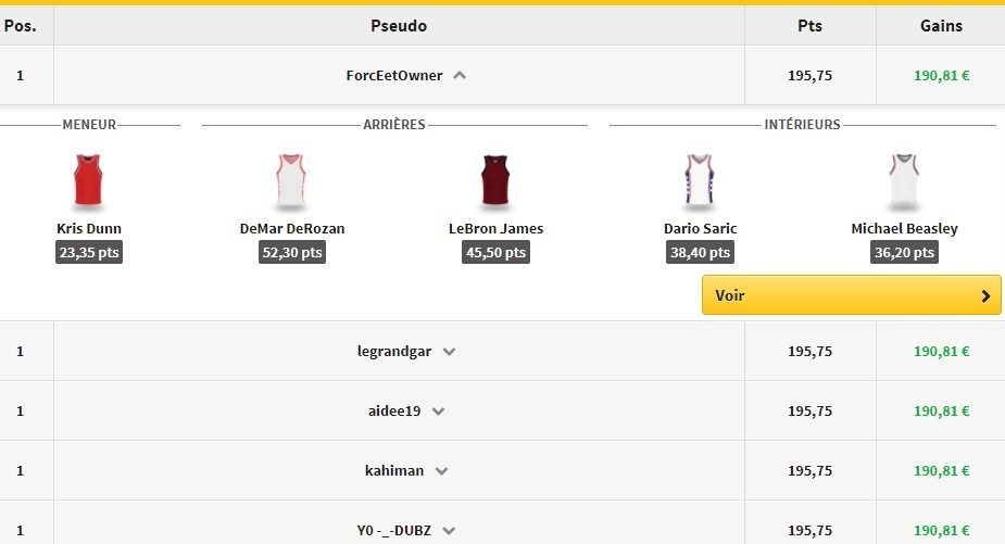 Il y a pas moins de 21 vainqueurs ! Il fallait jouer le 5 Dunn, DeRozan, LeBron, Saric et Beassley pour un total de 195.75 points et seulement 190.81€ à la clé.