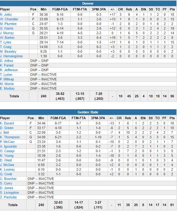 Face à une équipe de Denver bien équilibrée menée par Gary Harris (19 points à 6/14), Nikola Jokic (18 points à 9/16, 9 rebonds et 4 passes) et Jamal Murray (14 points à 4/10, 6 rebonds, 5 passes), les Warriors se sont inclinés 96-81 sur leur parquet de l’ORACLE Arena cette nuit.
