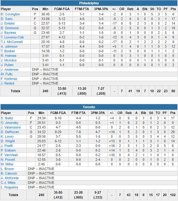 Embiid a pris les 6 premiers tirs de son équipe, marqué 8 points dans le 1er quart, mais Ibaka déjà 13 après un quart-temps. Les deux équipes étaient à égalité 27 partout après 12 minutes de jeu. Philadelphie a ensuite perdu 10 ballons dans le 2ème quart et Toronto a filé devant 55-46 à la pause. DeRozan a marqué 16 points dans le 3ème quart, bouclé sur un 13-3 par Toronto, devant 81-63 avant le dernier quart, remporté 23-21 par les Sixers.
