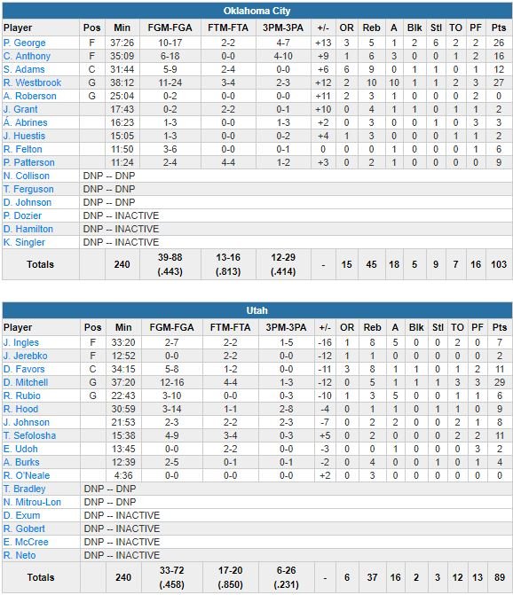 Ça fait 4 de suite pour le Thunder, vainqueur du Jazz à Salt Lake City 103-89 cette nuit. Russell Westbrook a signé son 11ème triple-double de la saison (27 points à 11/24, 10 rebonds et 10 passes), Paul George l’a bien secondé avec 26 points à 10/17, 5 rebonds, 2 rebonds et 6 contres et Carmelo Anthony a ajouté 16 points à 6/18, 6 rebonds et 3 passes.