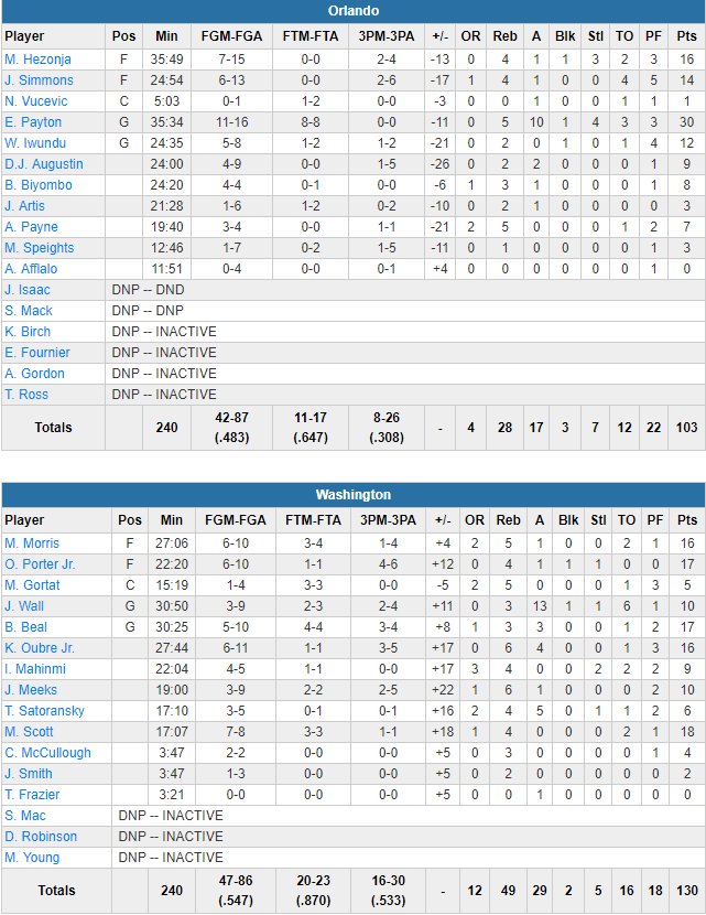 Washington a vu sa tâche facilitée après 5 minutes de jeu puisque Nikola Vucevic a dû quitter ses coéquipiers, victime d’un doigt cassé. Les locaux ont fait un festival offensif avec 54.7% au tir dont un 16/30 derrière l’arc et pas moins de 7 joueurs à au moins 10 points. Mike Scott termine avec 18 points à 7/8 alors que Bradley Beal et Otto Porter en marquent 17 chacun et Kelly Oubre et Markieff Morris 16. John Wall réalise un double-double avec 10 points et 13 passes. En face sans Evan Fournier, Aaron Gordon et Nikola Vucevic, c’est Elfrid Payton qui a pris les choses en main avec un énorme double-double : 30 points à 11/16, 10 passes et 4 interceptions.