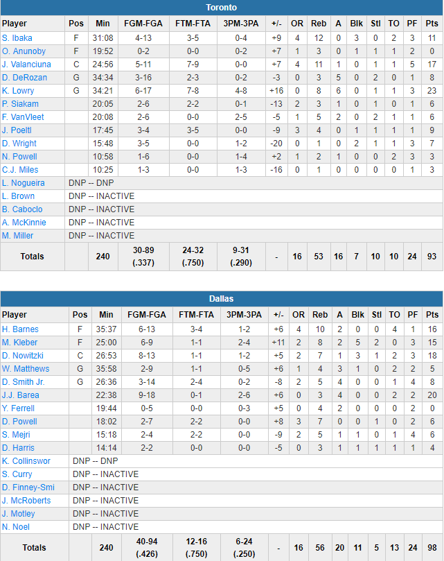 JJ Barea est le grand artisan du succès de Dallas, auteur de 20 points à 9/18 et 4 passes en 23 minutes, bien aidé par le trio Dirk Nowitzki (18 points à 8/13 et 7 rebonds), Harrison Barnes (16 points à 6/13) et 10 rebonds) et Maxi Kleber (15 points, 8 rebonds et 5 contres). Dallas shoote à seulement 42.6% mais les Raptors ont vécu un cauchemar en attaque avec 33.7% de leurs tirs réussis à l’image du 3/16 pour 8 points de DeMar DeRozan. Kyle Lowry signe 23 points à 6/17, 8 rebonds et 6 passes alors que Jonas Valanciunas compile 17 points à 5/11 et 11 rebonds.