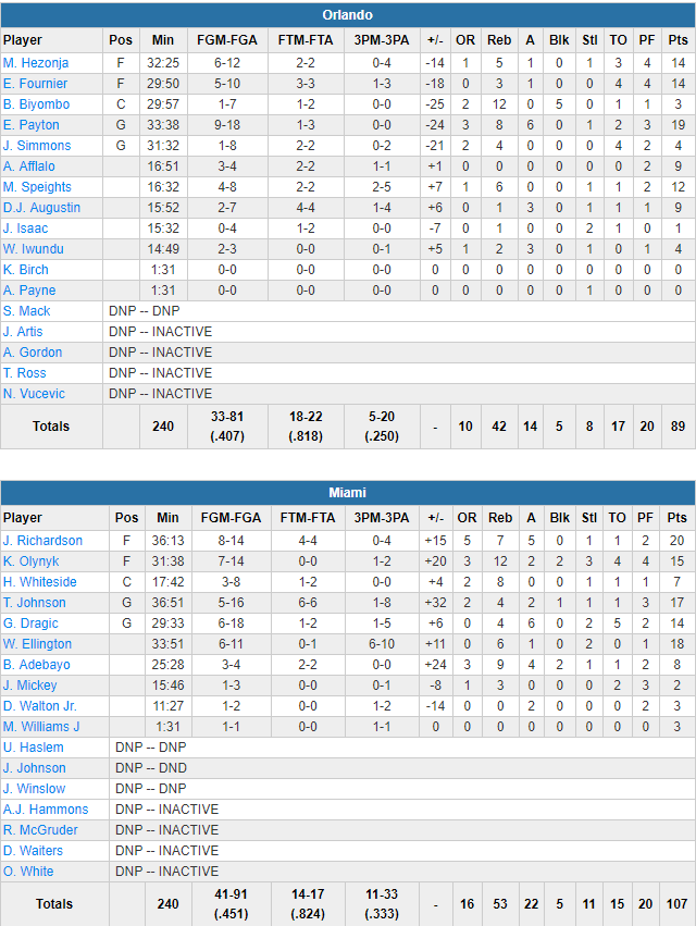 Le Heat a enfoncé son voisin floridien mais cela n’a pas été si simple malgré un score final de 107-89. A l’entame des 12 dernières minutes le score était de parité 68-68 mais le Heat a pris feu, notamment Wayne Ellington (12 de ses 18 points en dernier acte dont 4 3-pts en moins de 4 minutes) et Josh Richardson (14 de ses 20 points dans le dernier quart). Hassan Whiteside (7 points, 8 rebonds) et Goran Dragic (14 points et 6 passes) faisaient leur retour. En face Orlando a été mené par les 19 points, 8 rebonds et 6 passes d’Elfrid Payton. Evan Fournier a effectué son retour et signe 14 points à 5/10.