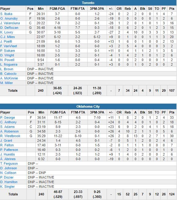 OKC a trouvé la formule gagnante depuis 6 matchs. Cela a encore été le cas cette nuit lors de la réception de Toronto, avec une victoire 124-107 portée par Paul George (33 points à 11/17, 7/10 à 3-points -record de franchise égalé- et 8 rebonds), Russell Westbrook (30 points à 11/22, 8 rebonds et 13 passes), Carmelo Anthony (18 points à 8/15, 4 rebonds, 4 passes) et Steven Adams (18 points à 8/9, 9 rebonds).
