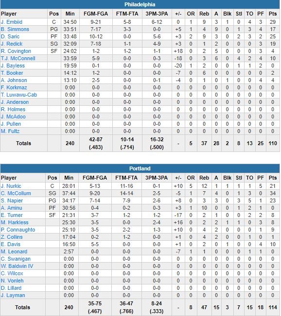 Menés de 13 points au début du 4ème quart-temps, les Blazers ont passé un 42-25 à Philadelphie pour s’imposer 114-110 au Moda Center cette nuit. Titulaire à la place de Damian Lillard (ischio-jambier), Shabazz Napier a marqué 22 de ses 23 points (record en saison) en seconde mi-temps alors que C.J. McCollum termine meilleur marqueur du match (34 points) et que Jusuf Nurkic ajoute un gros double-double (21 points et 12 rebonds).